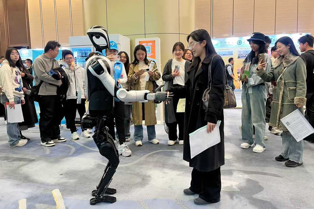 图为乐聚机器人与求职者互动。邹臻杰/摄