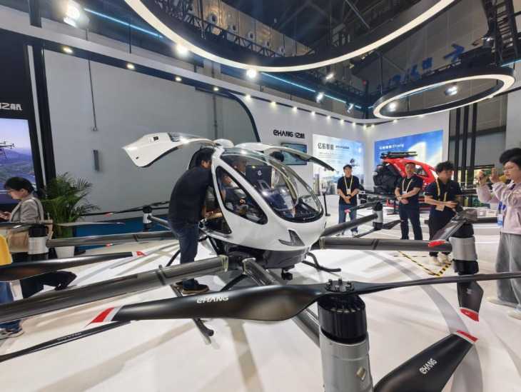 图为亿航智能在第五届消博会上展示的无人驾驶载人电动垂直起降航空器EH216-S。新华社记者吴茂辉摄