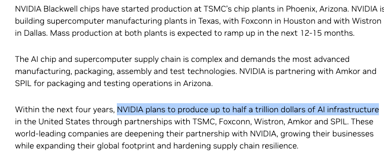 英伟达披露,已在亚利桑那州启用超百万平方英尺的生产空间,用于Blackwell芯片制造测试,并在得克萨斯州与合作伙伴共建AI超级计算机生产线。同时,Blackwell芯片本体已在凤凰城的台积电晶圆厂启动生产。英伟达还在休斯顿(与富士康合作)、达拉斯(与纬创合作)建立制造基地,预计12-15个月内逐步提升产量。