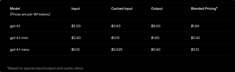 价格方面,GPT-4.1系列在性能提升的同时,价格更具竞争力。GPT-4.1相比GPT-4o价格降低26%,而GPT-4.1 Nano作为最小、最快且最便宜的模型,每百万token的成本仅为12美分。