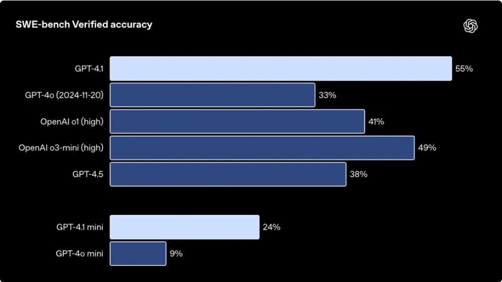 在编码能力测试中,GPT-4.1在SWEBench评估中的准确率达到55%,远超GPT-4o的33%。