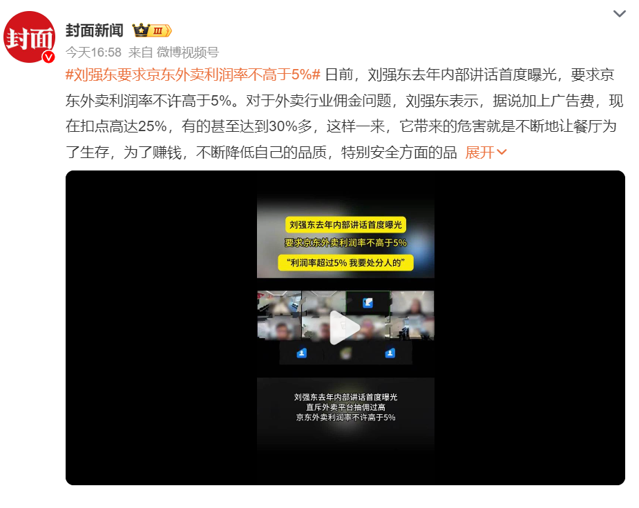 刘强东内部讲话揭秘:严控京东外卖利润率,上限设为5%