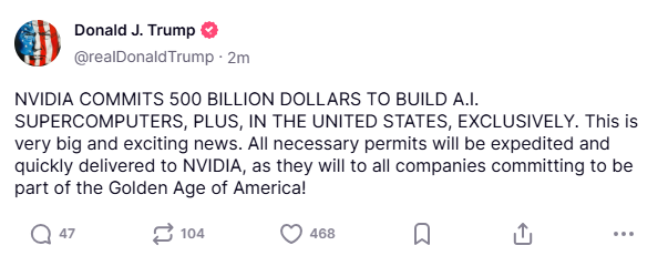 针对英伟达计划斥资5000亿美元在美国独家研发AI超级计算机这一重磅消息,美国总统特朗普迅速在“真实社交”平台上发文表示支持,称“这是一个激动人心的重大科技进步”。特朗普强调,政府将全力配合,加速办理所有必要的许可,确保项目尽快落地并交付给英伟达,以推动美国在AI领域的领先地位。