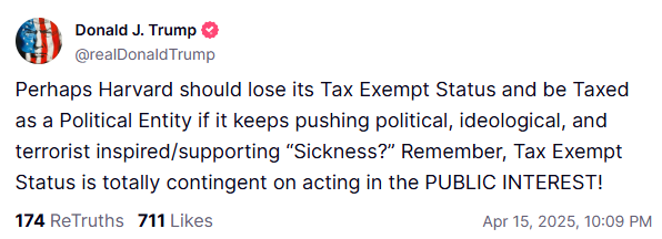 当地时间4月15日,美国总统特朗普在社交平台“真实社交”发文称,也许哈佛应该失去免税地位,免税地位取决于公共利益。特朗普认为哈佛大学在公共事务中扮演的角色并不符合其免税地位,或许应该将哈佛大学作为政治实体征税。此举引发了广泛关注和讨论,关于高校免税地位的争议再度升级。