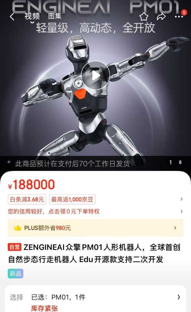 4月15日,小编在购物平台上发现,近期在社交媒体上与“甲亢哥”共舞的众擎机器人ENGINEAI PM01已上线销售,售价为18.8万元。此外,众擎还推出了另一款双足机器人——ENGINEAI SA01,仅售4.2万元。
