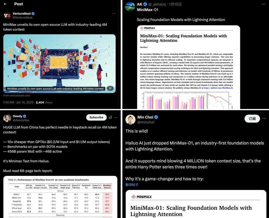 硅谷科技媒体VentureBeat及众多AI科技学者、投资人与创作者高度评价MiniMax-01系列模型的架构创新及长文本能力。