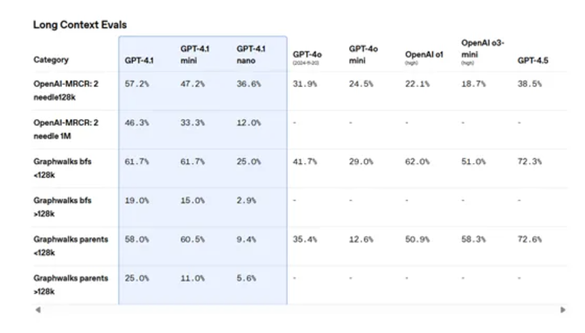 除了GPT-4.1,OpenAI还推出了GPT 4.1-Mini和GPT 4.1-Nano两款模型,实现了性能的大幅提升。GPT-4.1系列模型能够处理多达100万tokens的上下文,是GPT-4的8倍,显示了其强大的处理能力和金融应用潜力。