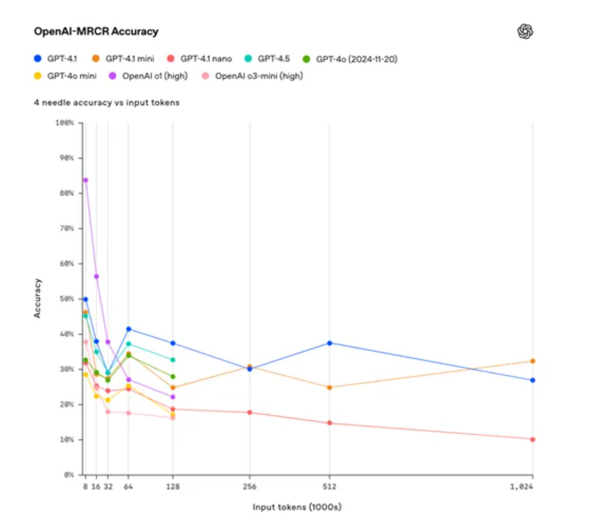 OpenAI在长文本测试中发现,GPT-4.1系列模型能够在长达100万tokens的上下文中准确找到目标文本。同时,在多轮指代消解测试中,GPT-4.1在处理复杂对话时展现出卓越的理解和推理能力。