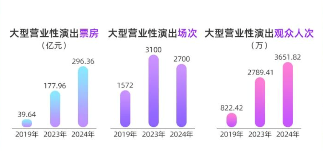 2024年,演出市场继续回暖。数据显示,2024年我国5000人以上大型营业性演出共0.27万场,票房收入高达296亿元,观众人数达3652万。大型营业性演出票房已占据演出市场总票房的51.1%。