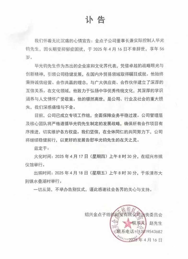 蓝鲸新闻4月17日讯(记者汤诗韵)4月16日,绍兴金点子纺织科技有限公司治丧委员会发布讣告,公司董事长兼实际控制人毕光钧先生,因长期受抑郁症困扰,不幸离世,享年56岁。这位纺织业的佼佼者,其一生充满了传奇色彩。