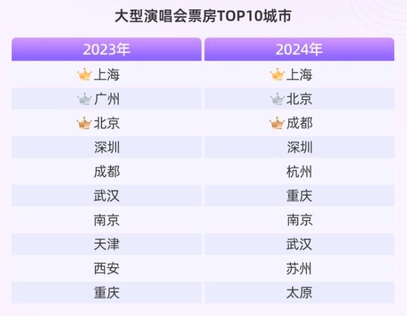 演唱会市场表现尤为亮眼,2024年大型演唱会票房突破260亿,同比增长78.1%,观众人数超过2900万人次,同比增长45%,成为演出市场的票房冠军。这些演唱会主要集中在京津冀、长三角、珠三角、川渝等城市群,贡献了全国63.5%的票房,其中长三角地区票房同比提升至31.4%。广东、上海、浙江等地票房突破10亿大关。