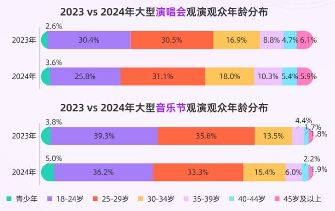 观众构成方面,2024年大型演唱会中女性占比66.1%,同比增长2.1%。大型音乐节中女性占比也达到67.1%。观众年龄构成更趋成熟,大型演唱会35岁+观演观众占比21.6%,同比增长2.1%。大型音乐节虽然相对年轻,但35岁+观众占比也同比提高2.2%。