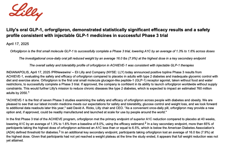 礼来公司口服GLP-1药物Orforglipron实现积极3期试验结果