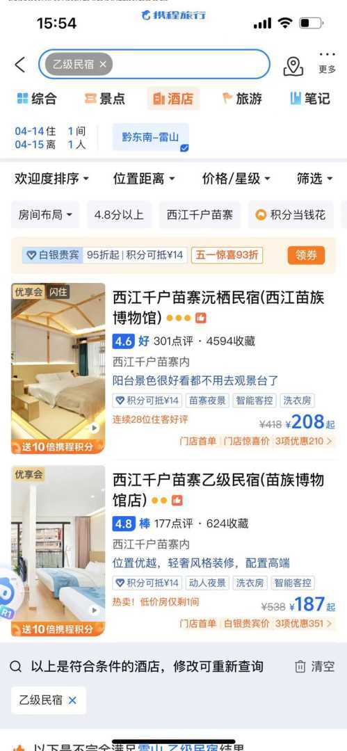 记者在某平台搜索“乙级民宿”,显著位置显示西江千户苗寨两家民宿,均称符合条件。但文旅部网站未查询到这两家民宿。