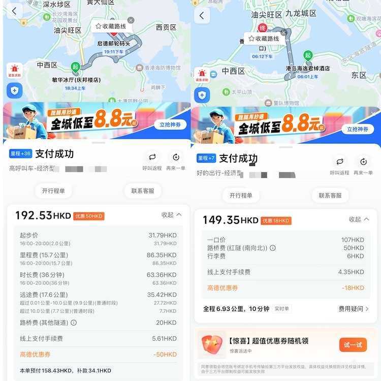 蓝鲸汽车在香港实测高德打车服务(左为网约车,右为出租车)