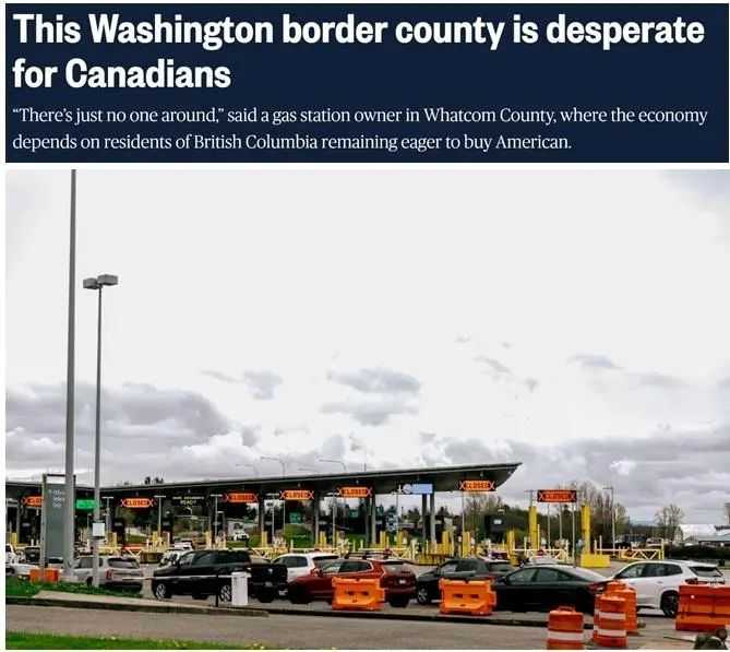 美国全国广播公司报道称,华盛顿州边境城镇的经济长期依赖加拿大客流,关税政策导致加拿大人抵制前往这些城镇,经济已濒临崩溃。