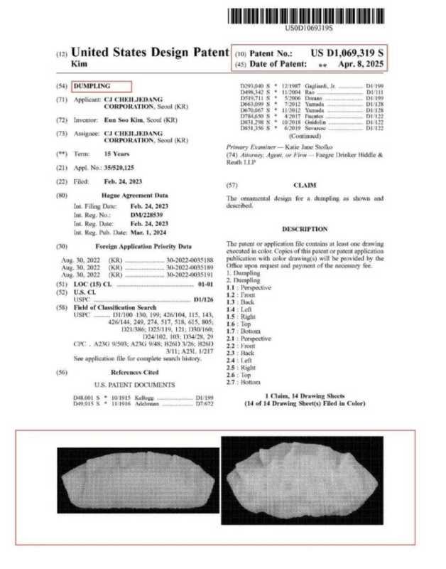 据了解,CJ公司共提交了14张各个角度的饺子照片。文件显示,该专利申请日期为2023年2月24日,获批日期为2025年4月8日,专利的保护期限为15年。其申请的饺子外形,与我国的饺子高度相似。
