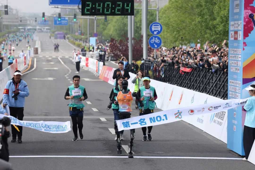上午10点11分,天工战队机器人以惊人的毅力与速度冲线完赛,全程用时约2小时40分42秒,成功摘得全球首个人形机器人半马桂冠。
