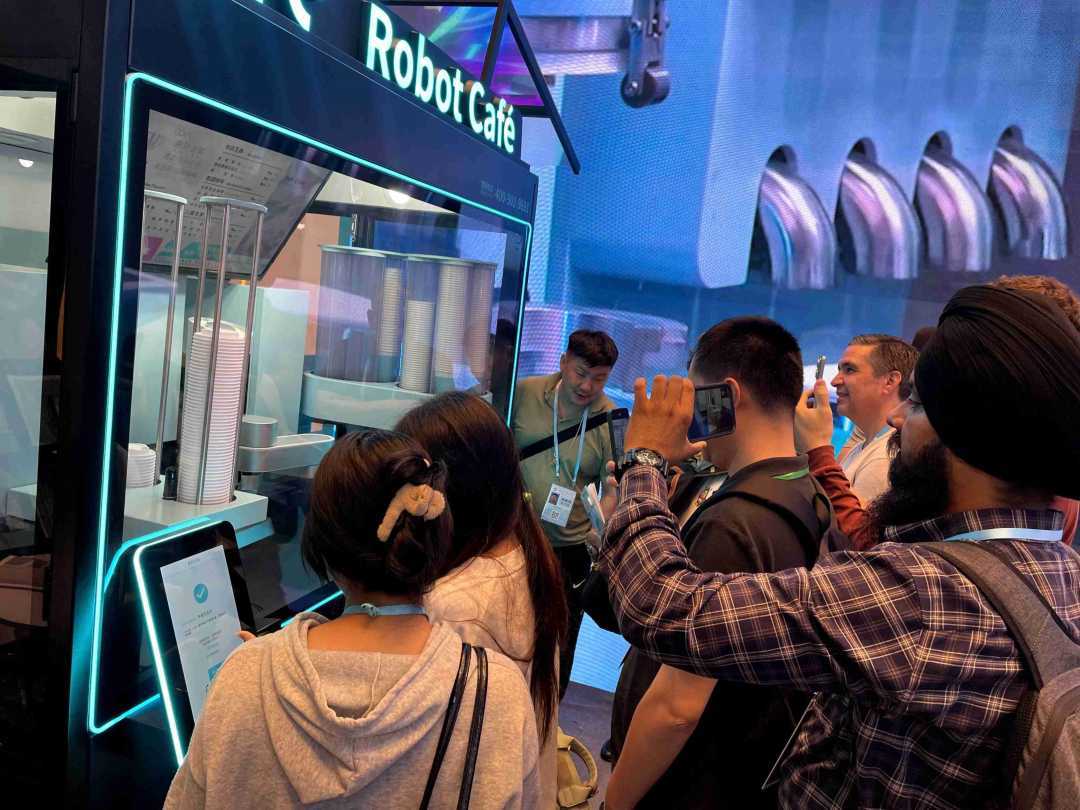 在该展区,不少展商排队体验一款可以自助点单、自动生产的咖啡机器人。COFE+品牌将旗下室内机器人现磨咖啡亭带来展会现场,相关产品已销往多个国际市场及国内十余个省市。工作人员还展示了可依据照片定制拉花的咖啡机器人。