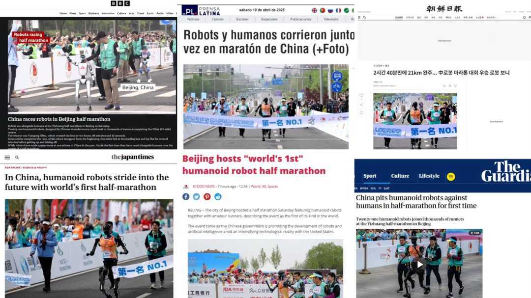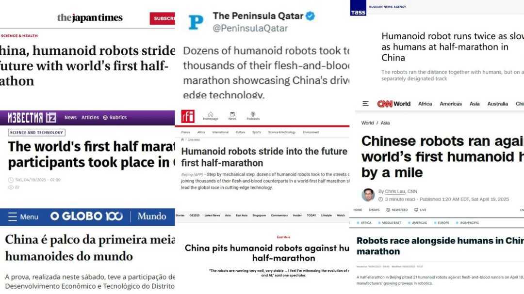 全球首个人形机器人半程马拉松在北京举行,吸引了全球五大洲多家媒体的广泛关注,报道纷纷聚焦此次人形机器人与人类一同登上马拉松赛场的历史性时刻,展示了中国在科技竞赛中的雄心。