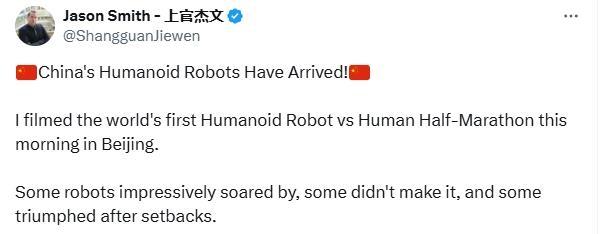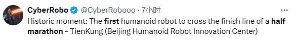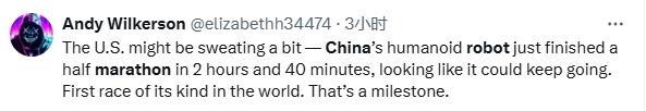 外国网友在观看了此次比赛后也纷纷留言,认为这是历史性的时刻。网友CyberRobo说:这是历史性时刻,“天工”,第一台人形机器人穿越了半马终点线。美国网友Andy Wilkerson表示,中国的仿人机器人刚刚以2小时40分钟的成绩完成了半程马拉松比赛,这是世界上第一场此类比赛,是一个里程碑。