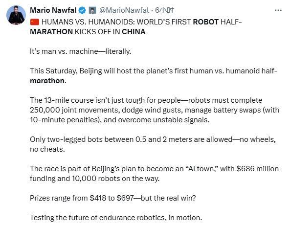 今天,由中央广播电视总台北京总站联合主办的全球首个人形机器人半程马拉松在北京亦庄鸣枪开跑,这场人形机器人VS人类的特殊比赛,因其全球首次的特性,不仅在国内引发广泛讨论,还吸引了全球五大洲多家媒体的广泛关注。