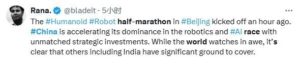 法新社评论称,此次比赛展示了中国引领尖端技术全球竞赛的雄心,进入赛道对人类来说是一小步,但对人形机器人来说却是一个巨大的飞跃。印度媒体今日印度也给予此次赛事积极评价,称中国正将其电影中的人机赛跑变为现实。