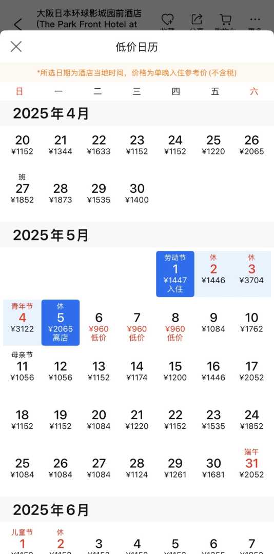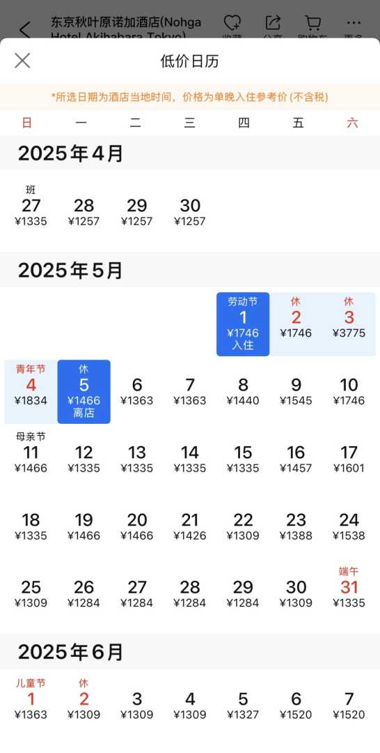由于五一假期与日本“黄金周”重叠,日本热门酒店价格大幅上涨。以东京为例,东京皇家王子大饭店5月3日的客房最低价格为3253元,与5月6日的1799元相比,涨幅约81%;东京秋叶原诺加酒店涨幅更是高达177%。大阪的情况也类似,大阪日本环球影城园前酒店和环球影城东方酒店的价格涨幅分别高达286%和613%。