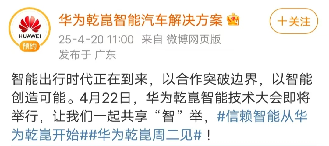 广汽集团董事长冯兴亚在微博透露,去年北京车展,广汽与华为携手启动“传祺华为联合创新计划”。此次,他将分享广汽与华为乾崑合作的最新成果。