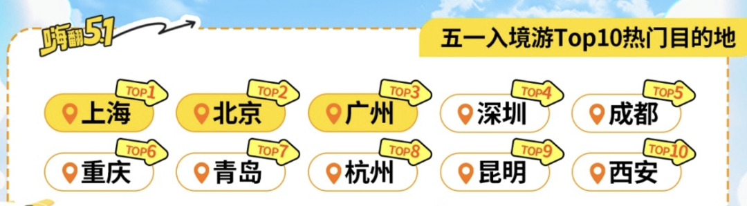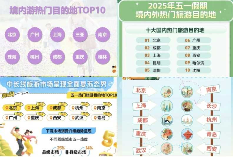 多家在线旅游平台五一热门目的地Top10榜单显示,一线、新一线城市及传统热门城市领跑榜单,北京、上海、广州、杭州、成都等城市登榜多个平台Top 10。