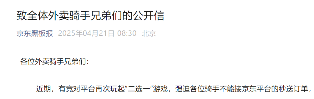 4月21日,京东发布《致全体外卖骑手兄弟们的公开信》,针对部分平台强迫外卖骑手“二选一”、不能接京东平台秒送订单的情况,京东推出多项举措,以保障骑手自由接单、提高收入。