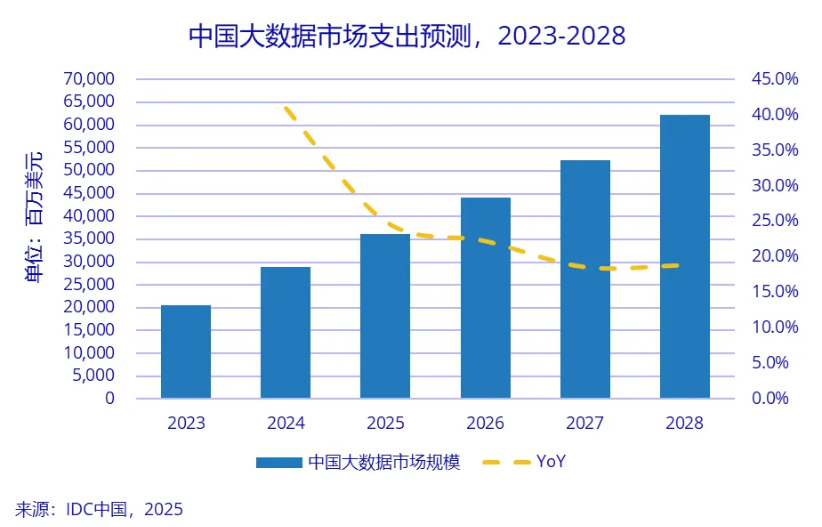 IDC预测,至2028年,中国大数据IT支出规模有望达到621.7亿美元,占全球比例约10%,五年复合增长率约为24.9%,增速领跑全球。