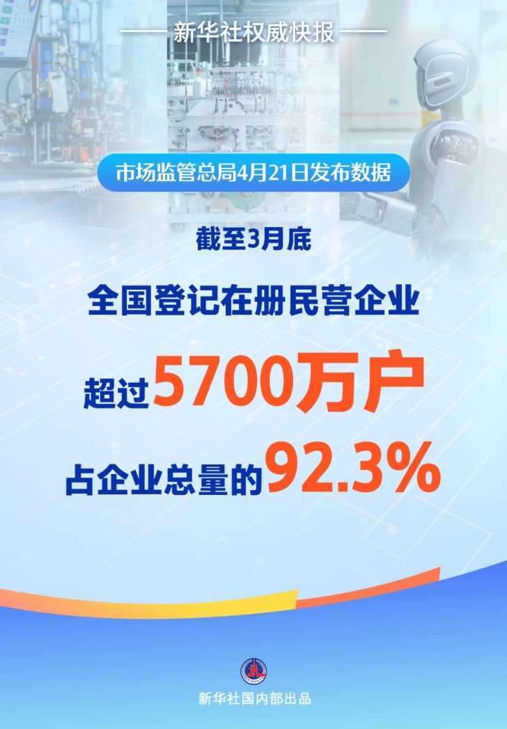 截至3月底,全国登记在册的民营企业数量已超过5700万户,占比高达企业总量的92.3%,彰显了民营经济在国民经济中的重要地位。