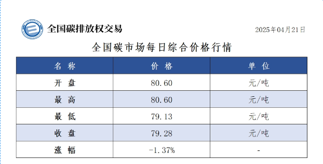 新华财经北京4月21日电 据微信公众号“全国碳交易”报道,今日全国碳市场综合价格行情出炉:开盘价为80.60元/吨,最高价同样达到80.60元/吨,最低价则为79.13元/吨,收盘价为79.28元/吨,较前一日下跌1.37%。