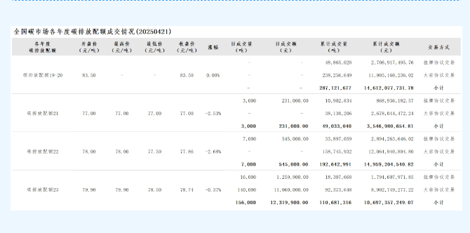 截至2025年4月21日,全国碳市场的碳排放配额累计成交量已达到惊人的639,479,024吨,累计成交额更是高达43,815亿元,即43,815,620,176.48元。这些数据无疑彰显了我国碳市场在推动绿色低碳转型中的重要作用。