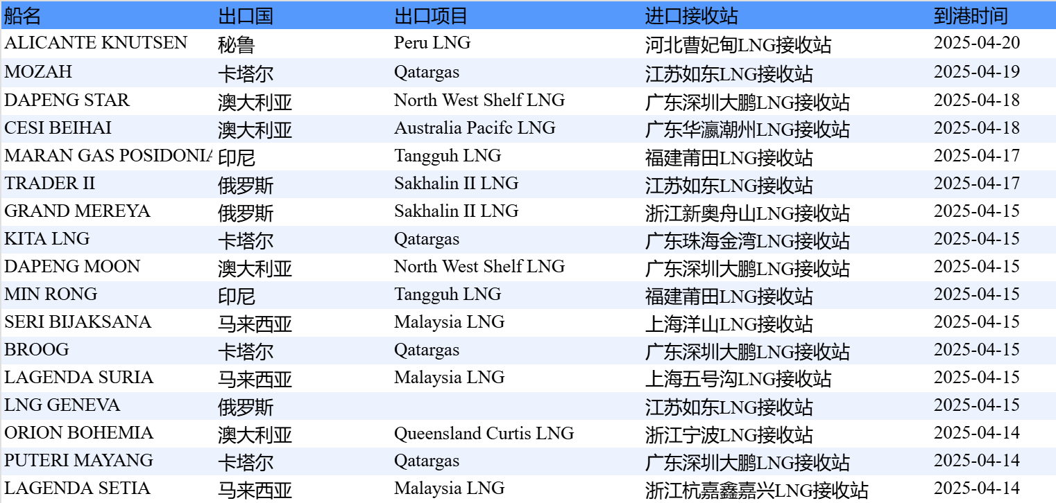 表1:4月14日-4月20日中国LNG进口分析