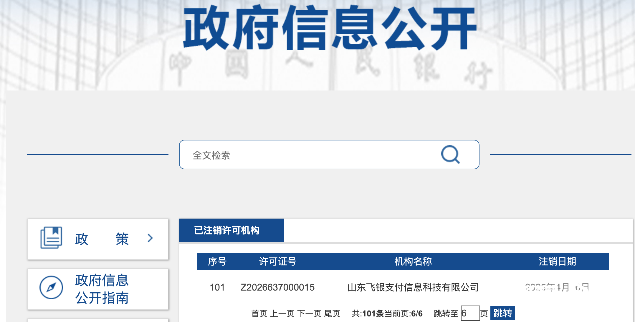 4月19日,人民银行最新公布的“支付业务许可信息公示-已注销许可机构”信息显示,支付机构山东飞银支付信息科技有限公司(简称“飞银支付”)牌照被注销,注销日期为2025年4月16日,成为今年第5家被注销牌照的支付机构。截至目前,累计已有101家支付机构牌照被注销。