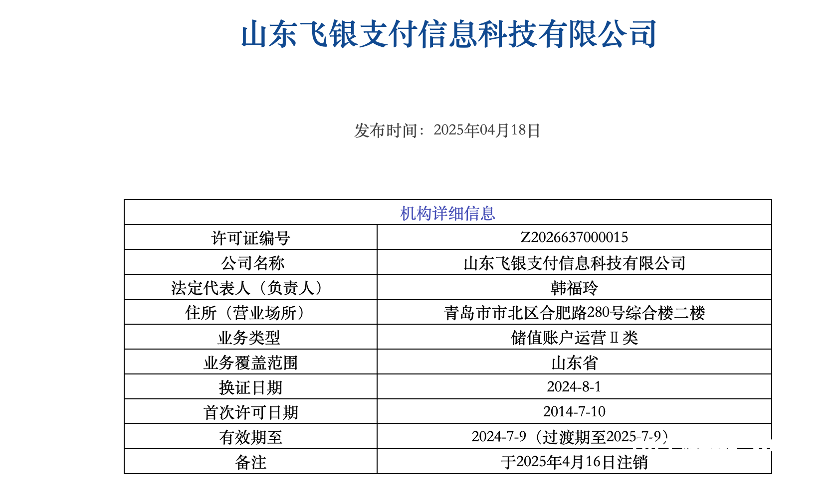 根据《非银行支付机构监督管理条例》,自2024年5月1日起施行,要求设立非银行支付机构需经中国人民银行批准,取得支付业务许可。去年7月,该公司名称由山东飞银智能科技有限公司改为山东飞银支付信息科技有限公司。但遗憾的是,牌照过渡期未结束即被注销。