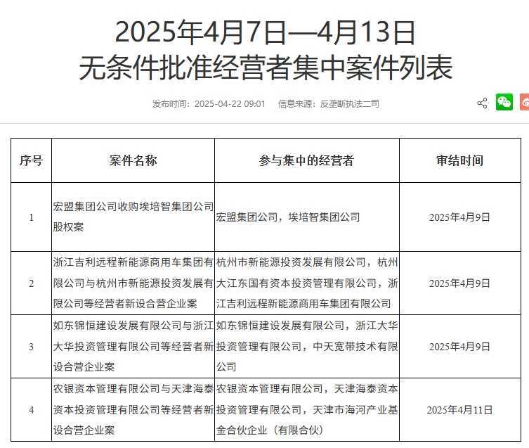 市场监管总局于2025年4月7日至4月13日期间,无条件批准了一系列经营者集中案件。其中包括浙江吉利远程新能源商用车集团有限公司与杭州市新能源投资发展有限公司等经营者新设合营企业案、如东锦恒建设发展有限公司与浙江大华投资管理有限公司等经营者新设合营企业案,以及农银资本管理有限公司与天津海泰资本投资管理有限公司等经营者新设合营企业案。这些合作旨在促进新能源和资本市场的深度融合,推动相关行业的进一步发展。