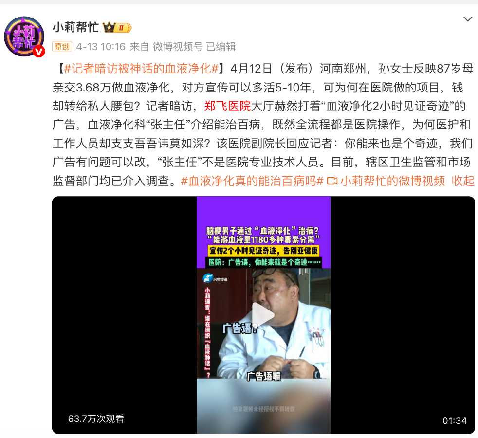 近日,有媒体曝光河南郑州孙女士87岁母亲花费3.68万元在郑飞医院进行所谓的“血液净化”,宣传称可“延年益寿”。