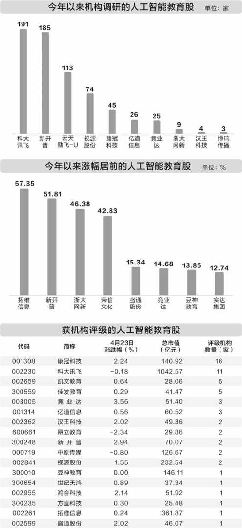 据证券时报·数据宝统计,A股中人工智能教育概念股有28只。4月23日,19只概念股上涨,其中浙大网新涨幅最大,达到7.79%,竞业达上涨3.56%,康冠科技、鸿合科技等5股涨幅均超2%。从年初至今,多只概念股实现大幅上涨,平均涨幅达到4.97%,拓维信息、新开普累计上涨超50%。