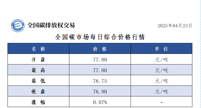 新华财经北京4月23日电据微信公众号“全国碳交易”,今日全国碳市场综合价格行情表现平稳:开盘价77.00元/吨,最高触及77.00元/吨,最低下探至76.75元/吨,最终收盘价定格在76.90元/吨,较前一日微涨0.07%,显示出市场交易的稳定性。