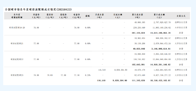 截至2025年4月23日,全国碳市场碳排放配额累计成交量已达到惊人的640,143,891吨,累计成交额也攀升至43,868,876,162.48元,标志着我国碳市场的快速发展与壮大。