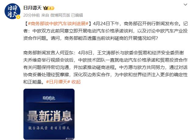 4月24日下午,商务部召开例行新闻发布会。记者提问:中欧双方此前同意立即开展电动汽车价格承诺谈判,并讨论中欧汽车产业投资合作问题。请问,商务部能否透露当前中欧电动汽车价格承诺谈判及贸易投资合作的磋商开展情况?