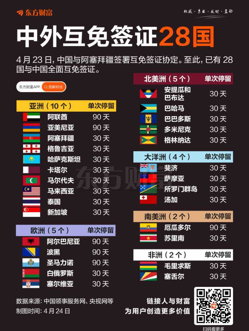 4月23日,中国与阿塞拜疆正式签署互免签证协定,至此已有28个国家与中国实现全面互免签证。协定规定,两国公民可在对方国家享有30天免签停留,部分国家已取消单次停留30天限制,延长至90天。此举将促进两国旅游与交流。