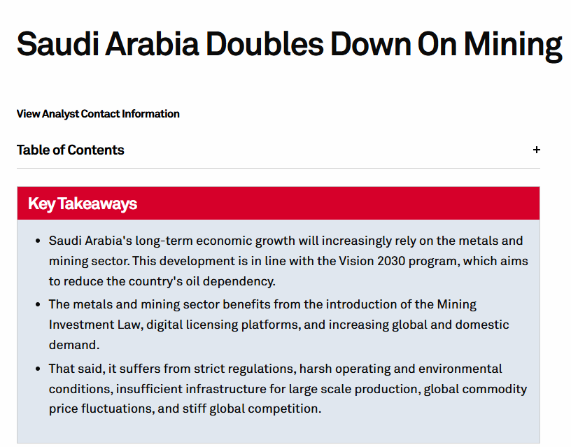 标普全球近日发布报告指出,金属与矿业将在沙特未来的经济增长中占据更加核心的地位,这一趋势与沙特“愿景2030”战略方向高度契合,旨在减少对石油经济的依赖,转向多元化发展。