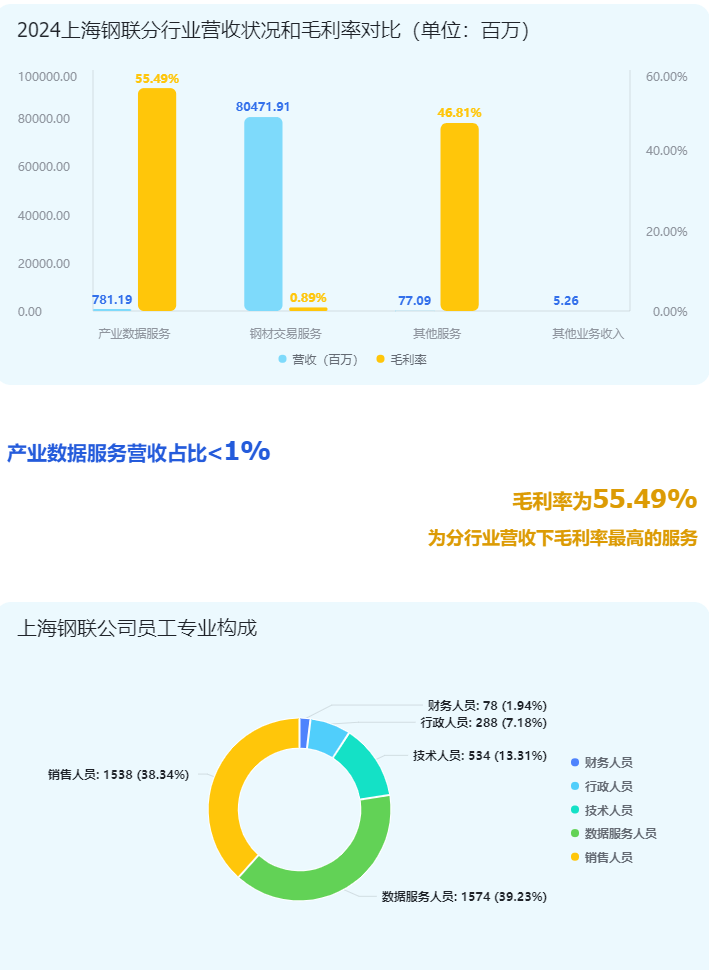 数据显示,产业数据服务营收占比虽不到上海钢联总营收的1%,但却是分行业中毛利率最高的板块。2024年上海钢联产业数据服务毛利率为55.49%,是钢材交易服务的62倍。