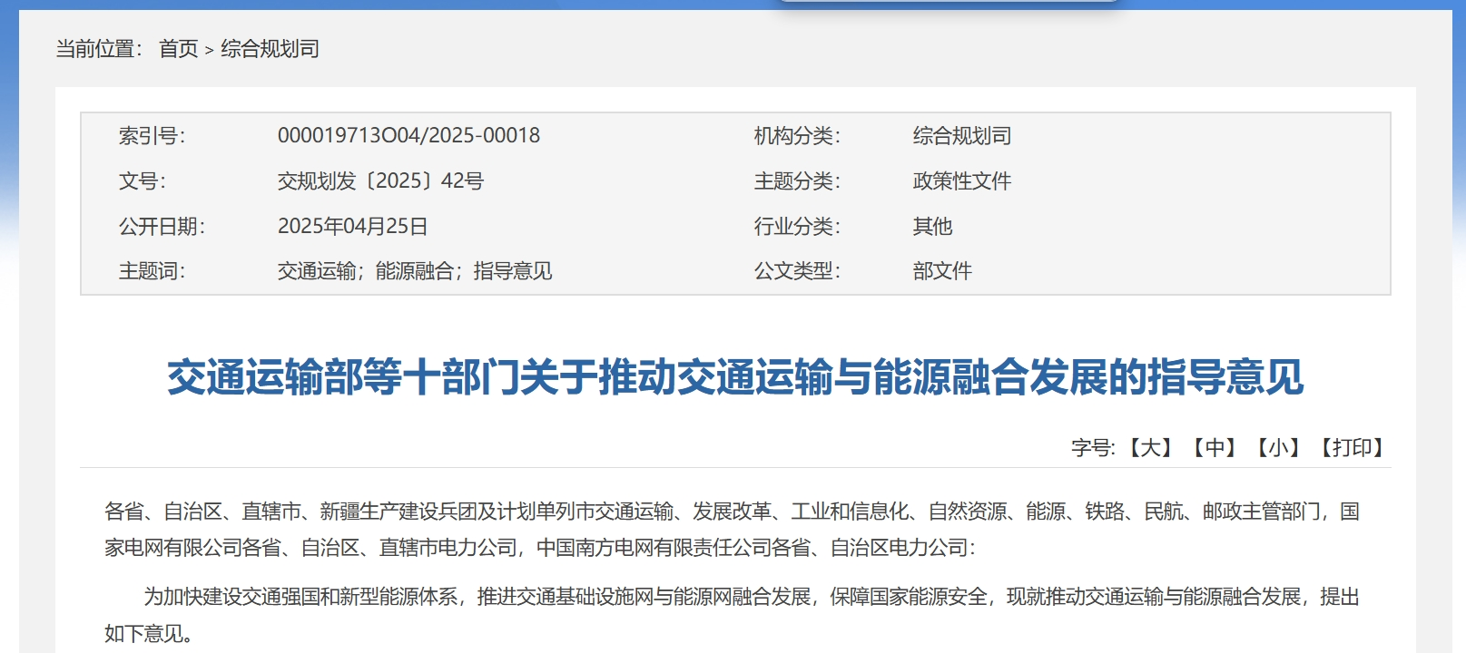 4月25日,交通运输部等十部门发布关于推动交通运输与能源融合发展的指导意见。该意见旨在促进交通运输行业的绿色转型和能源的高效利用。