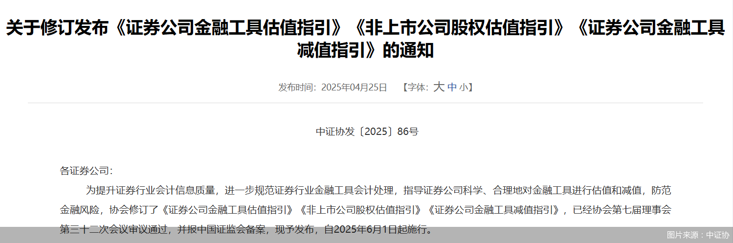 中证协发布公告,修订发布《证券公司金融工具估值指引》《非上市公司股权估值指引》《证券公司金融工具减值指引》三项指引,旨在规范证券行业金融工具会计处理,提升会计信息质量,防范金融风险,将于2025年6月1日起正式施行。