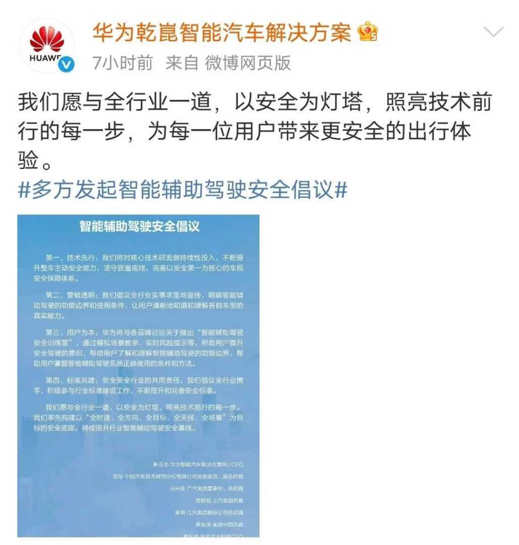 4月27日,华为乾崑智能汽车解决方案官方微博发布了《智能辅助驾驶安全倡议》。该倡议由华为智能汽车解决方案BU携手中国汽车技术研究中心及广汽集团、上汽集团、江汽集团、奥迪中国、东风猛士科技、岚图汽车、深蓝汽车、北汽新能源、阿维塔科技、赛力斯汽车、奇瑞汽车等11家车企高管共同发起,旨在推动智能辅助驾驶技术的安全发展。
